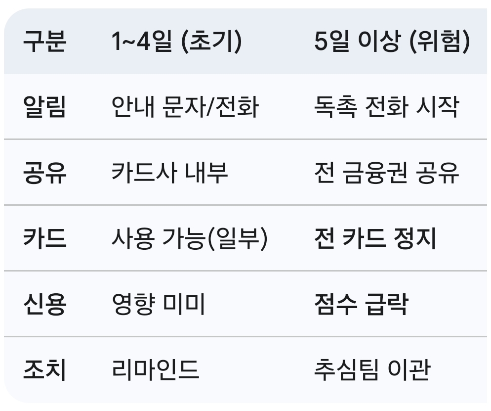 카드 대금을 하루나 이틀 늦게 낸다고 해서 당장 세상이 무너지지는 않습니다. 카드사에서도 고객의 단순 실수나 급여 입금 지연 등을 고려해 며칠간의 유예 기간을 두기 때문입니다. 하지만 이 기간이 5일을 넘어가면 상황은 급변합니다.