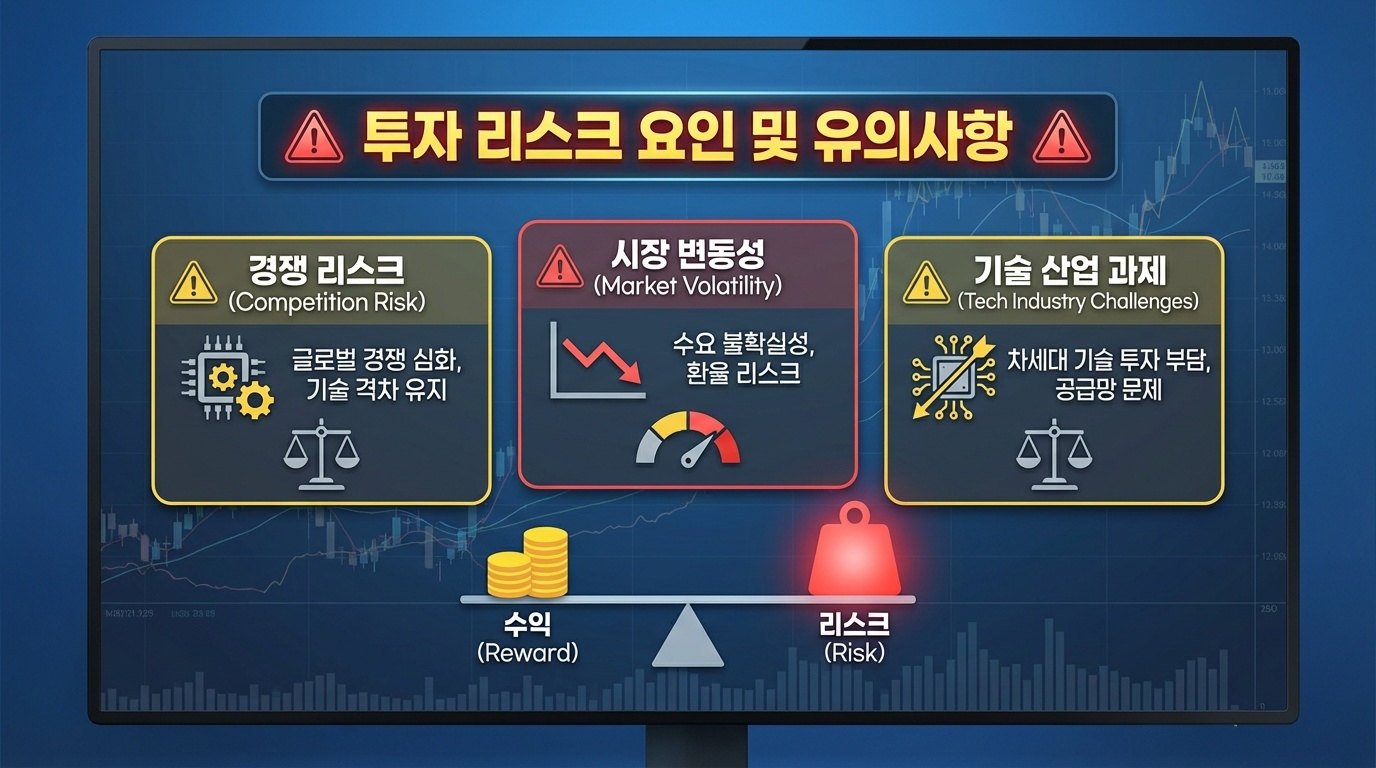 빅테크 기업들의 AI 투자 속도 조절 가능성도 리스크입니다. 현재 엔비디아, 마이크로소프트, 구글, 메타 등 빅테크 기업들이 AI 인프라에 막대한 투자를 진행하고 있지만, 경기 침체나 AI 버블론이 확산될 경우 투자 규모가 축소될 수 있습니다. 이 경우 HBM 수요에도 직접적인 영향을 미칩니다.