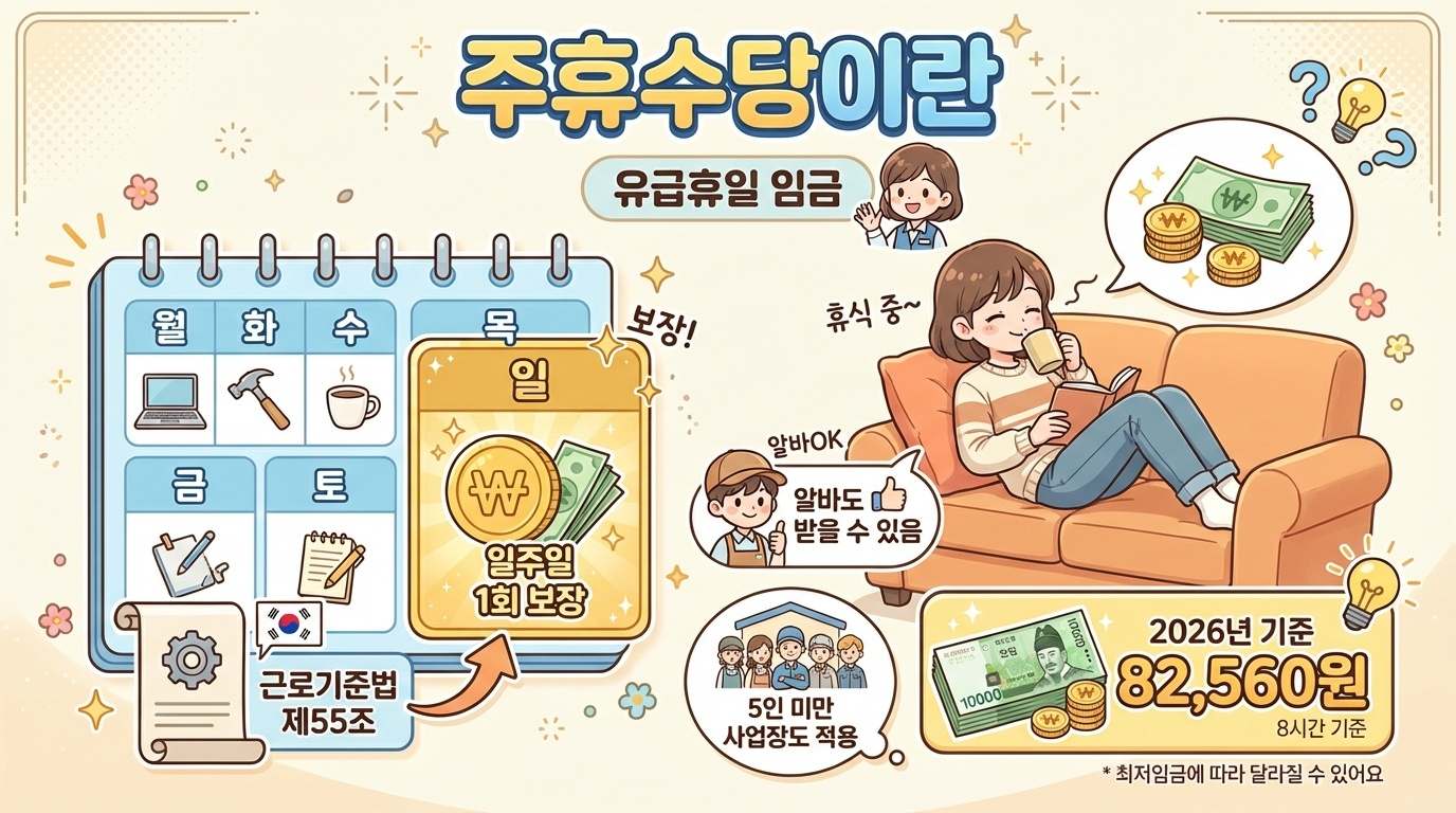 알바를 하면서 주휴수당을 제대로 받고 계신가요? 주휴수당은 일주일에 15시간 이상 근무하면 누구나 받을 수 있는 법적 권리입니다. 하지만 아직도 많은 분들이 정확한 지급조건과 계산법을 몰라서 못 받는 경우가 많습니다. 이 글에서는 2026년 최저시급 기준 주휴수당 계산법, 지급조건, 미지급 시 신고 방법까지 총정리해 드립니다. 😊