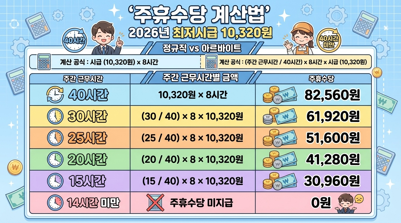 주휴수당 계산법은 정규직과 아르바이트가 다릅니다. 본인의 근무 형태에 맞는 공식으로 계산해 보세요. 2026년 최저시급 10,320원을 기준으로 설명드립니다.