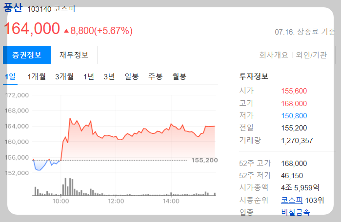 2025년 7월 16일, 풍산 주가가 역사적인 순간을 맞이했어요. 장중 16만 8000원까지 치솟으며 사상 최고가를 경신했고, 종가도 16만 4000원으로 마감했답니다. 이는 전날 대비 5.67% 상승한 수치로, 연일 신기록을 갈아치우고 있어요.