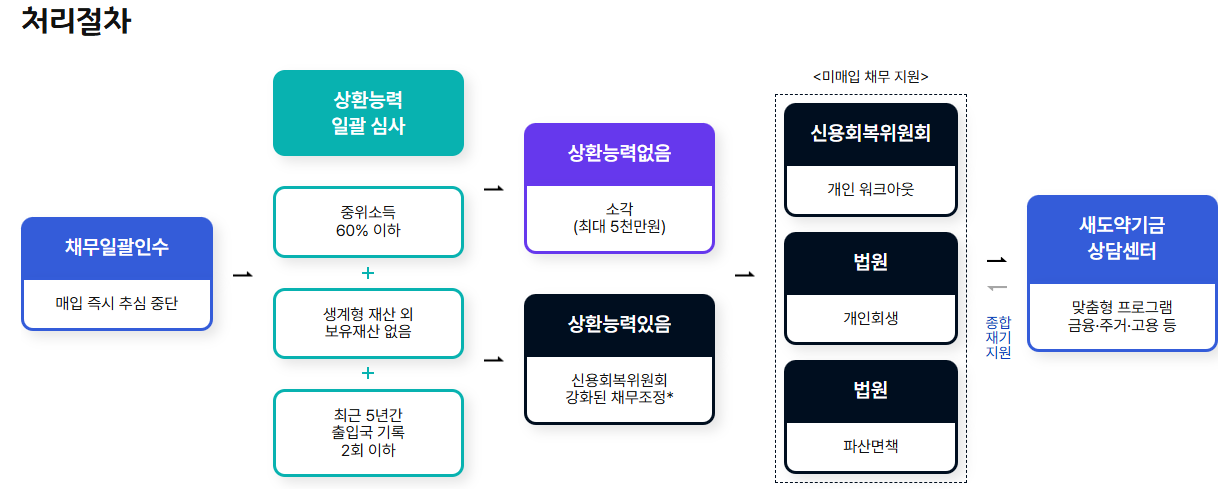 | 2단계: 추심 중단 | 채권 매입 즉시 모든 추심 활동 중지 | 빚 독촉으로부터 해방, 심리적 안정 확보 |